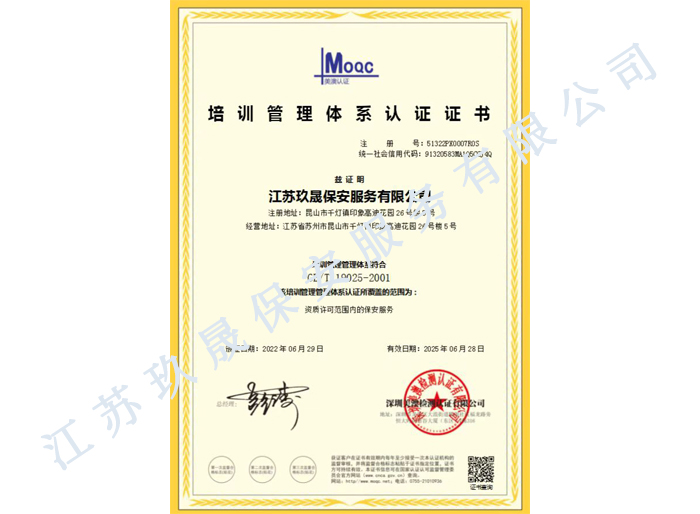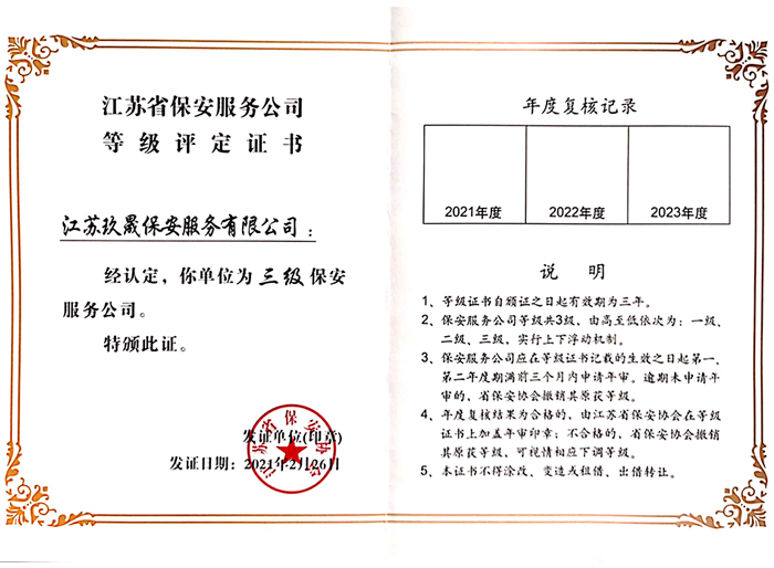 江蘇玖晟保安服務有限公司成立于江蘇省昆山市千燈鎮(zhèn)。注冊資金:5000萬,是擁有省公安廳頒發(fā)的保安服務許可證的企業(yè)【蘇公保服20170046】,也是昆山市保安協(xié)會常務理事單位。